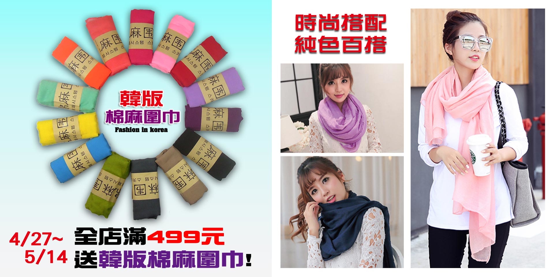 4/27~5/14全店購物滿499送韓版棉麻圍巾