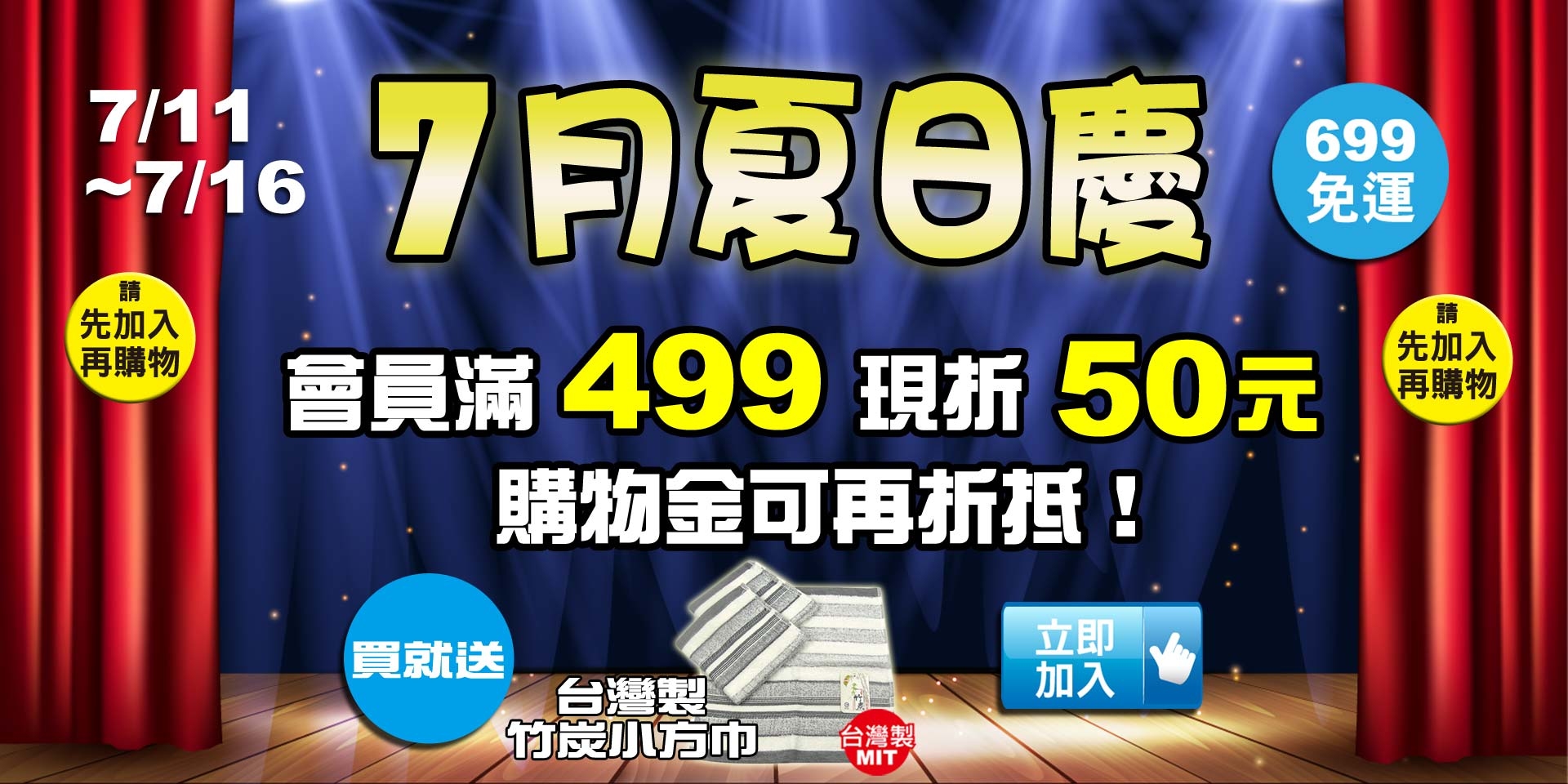 會員購物滿499免運現折50元,滿699免運、買就送台製竹炭方巾!